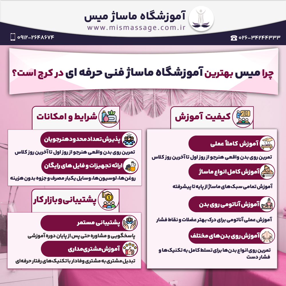 آموزشگاه ماساژ میس دورههای متنوعی را ارائه میدهد، مانند: ماساژ آروماتراپی، ماساژ بافت عمقی، ماساژ تای و سایر سبکهای ماساژ. برنامههای آموزشی میس (مرکز آموزش ماساژ در کرج) به شما این امکان را میدهند تا مهارتهای تخصصی خود را توسعه دهید.